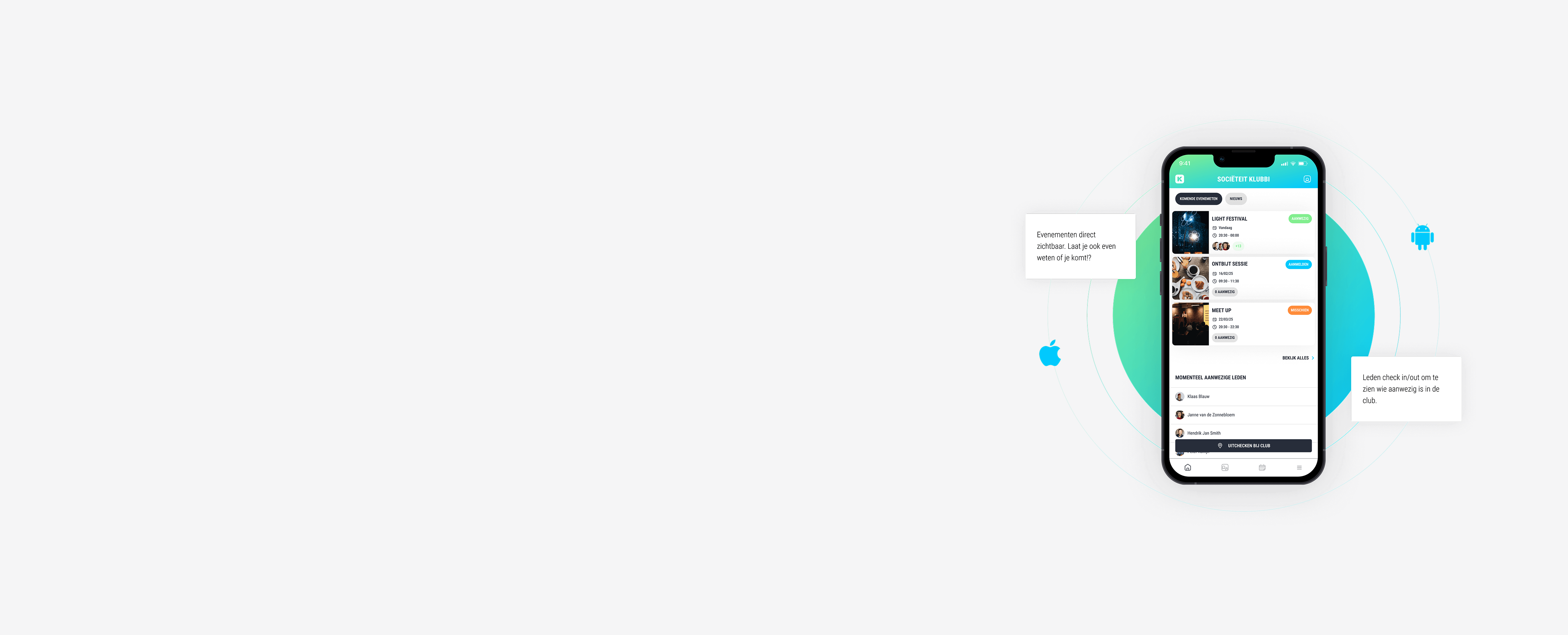 Klubbi is dé white-label app die clubs, verenigingen en sociëteiten helpt om hun leden te verbinden en de organisatie te stroomlijnen. Gebruikers kunnen via Klubbi evenementen organiseren, foto’s delen, berichten versturen en groepen aanmaken. Wat Klubbi bijzonder maakt, is dat elke club of vereniging de app volledig kan aanpassen aan hun eigen huisstijl, met unieke kleuren en een eigen logo. Zo voelt de app altijd persoonlijk en herkenbaar.